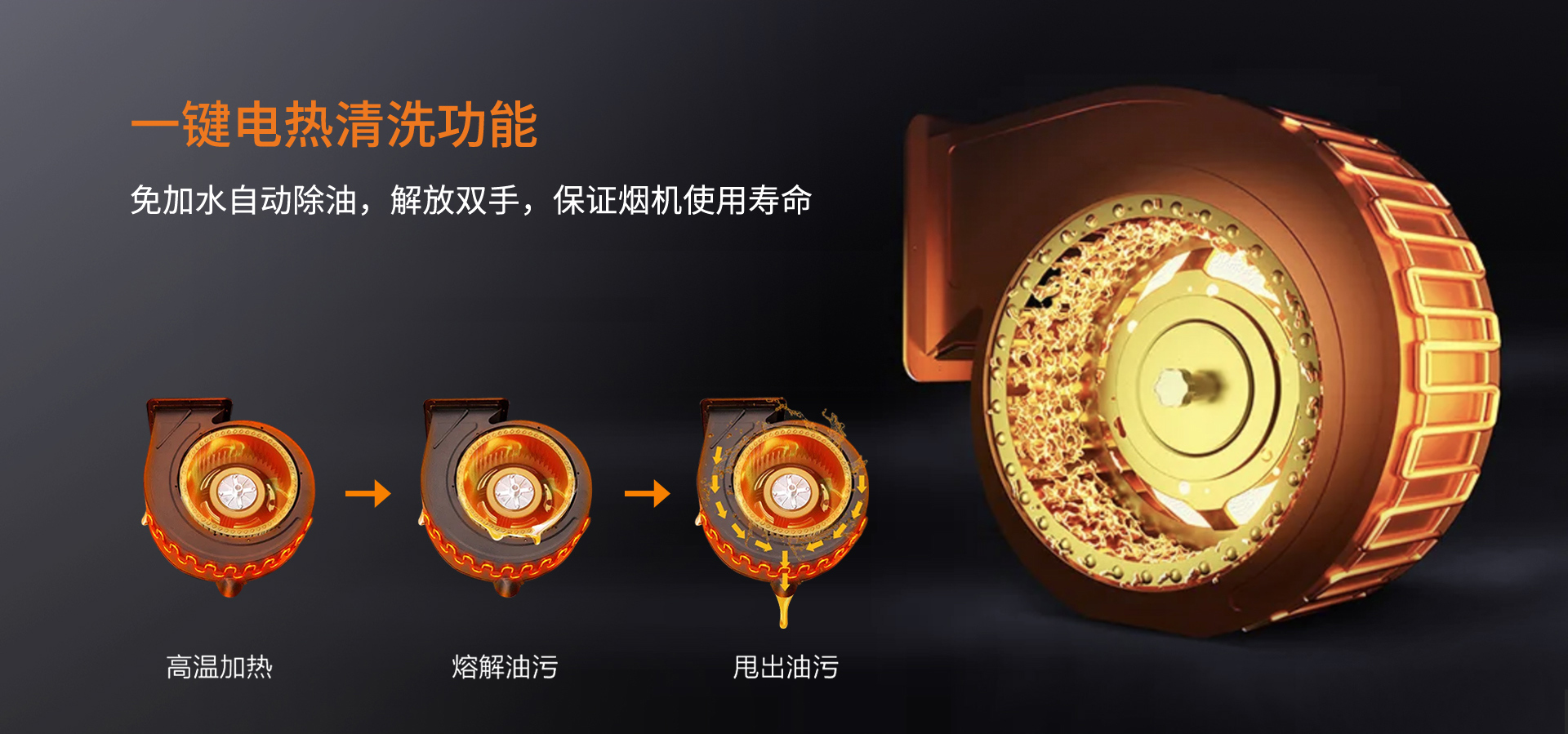 對于煙機清洗一直以來都被稱為廚房最強“洗”事,科恩T71采用一鍵電加熱清洗,無需拆卸,只需一鍵啟動就可將渦殼上的電加熱膜進行加熱,通過油垢溶解流出的方式來清理煙機內(nèi)部,同時,渦殼內(nèi)的高溫還可使風輪上的油垢軟化,隨著風輪的轉(zhuǎn)動將油垢甩出。