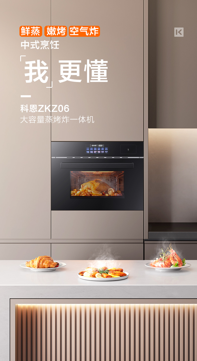 最后,科恩ZKZ06嵌入式蒸烤一體機擁有50L大容積四層擱架,可滿足多菜同時烹飪。